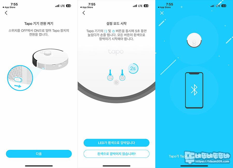 설정 모드가 작동하게 되면 Tapo 앱과 로봇 청소기가 블루투스로 연결이 되며 이후 2.4GHz Wi-Fi로 연결하는 과정을 거치게 되고요.
