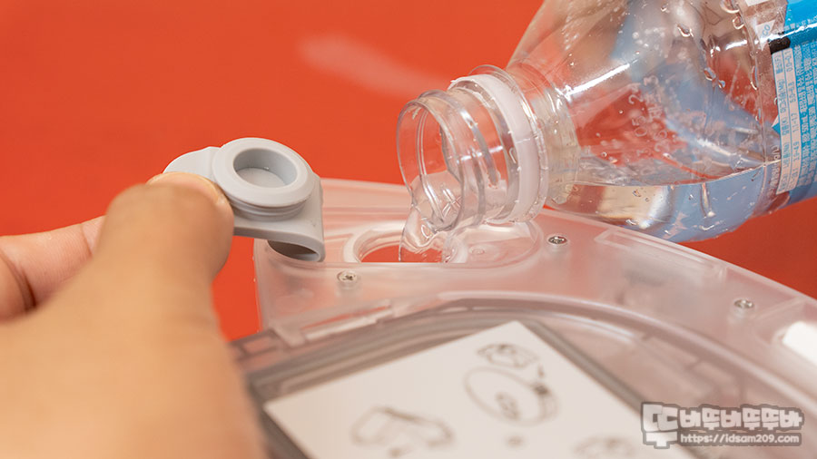300 ml 용량의 물탱크에 물을 채우면 200 m2 면적을 3단계 물 조절로 깨끗하게 물청소가 가능한데 물탱크에 물을 채울 때 로봇 청소기와 접촉되는 금속 부분이 물에 젖지 않게 주의하시기 바랍니다.