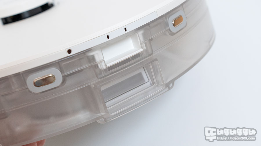 티피링크 Tapo RV30 Plus 라이다 물걸레 로봇 청소기 바닥면을 살펴보면 전면에는 360 회전 및 탈부착이 가능한 롤러, 이번 제품에서는 쓸 일이 없어 보이는 2개의 금속 충전 단자 그리고 제품 오른쪽에 3개의 긴 브러시가 회전하면서 먼지를 가운데로 쓸어주는 사이드 브러시, 중앙에 위치한 든든하고 안정적인 구동 바퀴 그리고 중앙에 롤러 방식으로 회전하는 메인 브러시, 물탱크 바닥면에는 센서를 통해 물이 공급되는 3개의 구멍(빨간 동그라미) 모습을 확인할 수 있습니다.