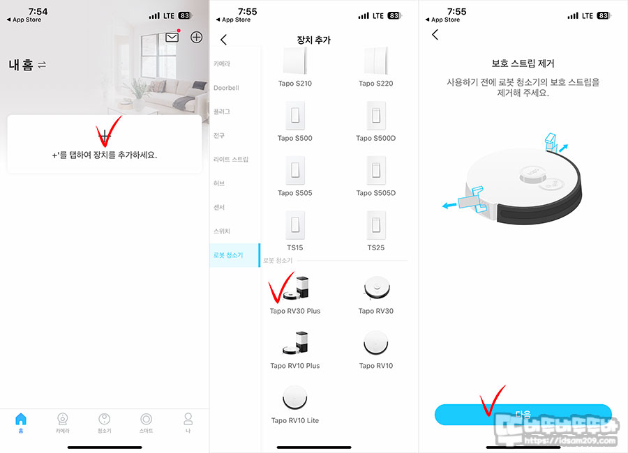 티피링크 Tapo 앱에서 + 버튼으로 티피링크 Tapo RV30 Plus 라이다 물걸레 로봇 청소기를 선택하고 안내에 따라 청소기 범퍼 양쪽 끈 부분에 부착된 보호 스트랩을 제거해 줍니다.