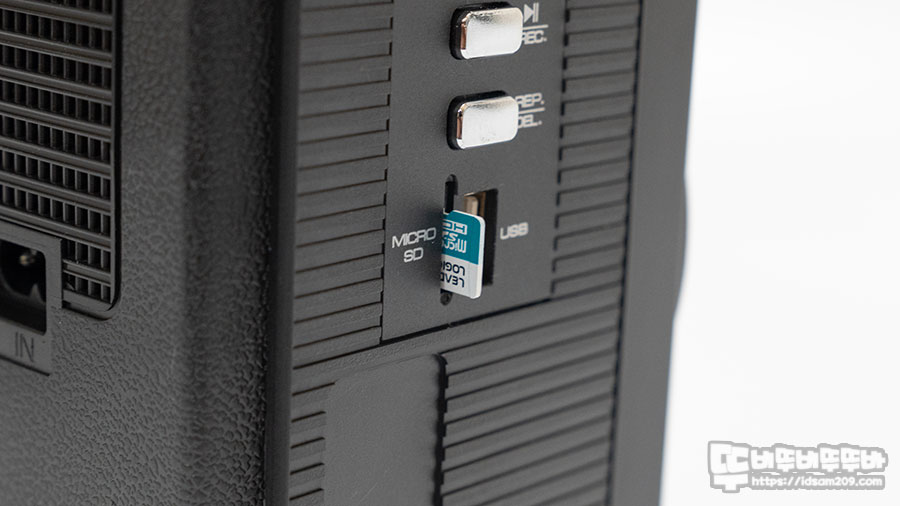 제품 측면에는 MicroSD 메모리와 USB 메모리를 컨트롤하는 버튼 구성을 확인할 수 있는데 조금 특이한 건 ▶||/Rec 부분인데요.