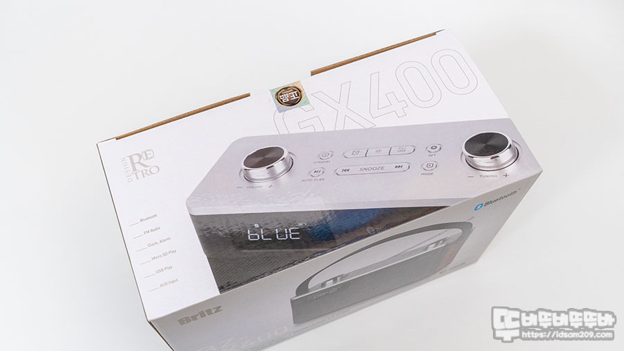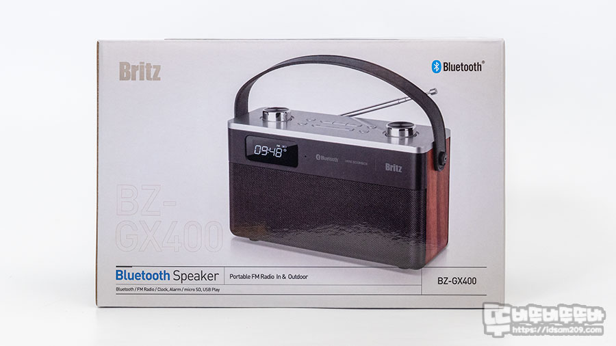 브리츠 BZ-GX400 휴대용 블루투스 스피커 패키지는 제품의 이미지가 인쇄된 모습에 블루투스, FM 라디오, 시계/알람, MircoSD, USB MP3 플레이가 가능한 All-in-One 제품임을 강조하고 있습니다.