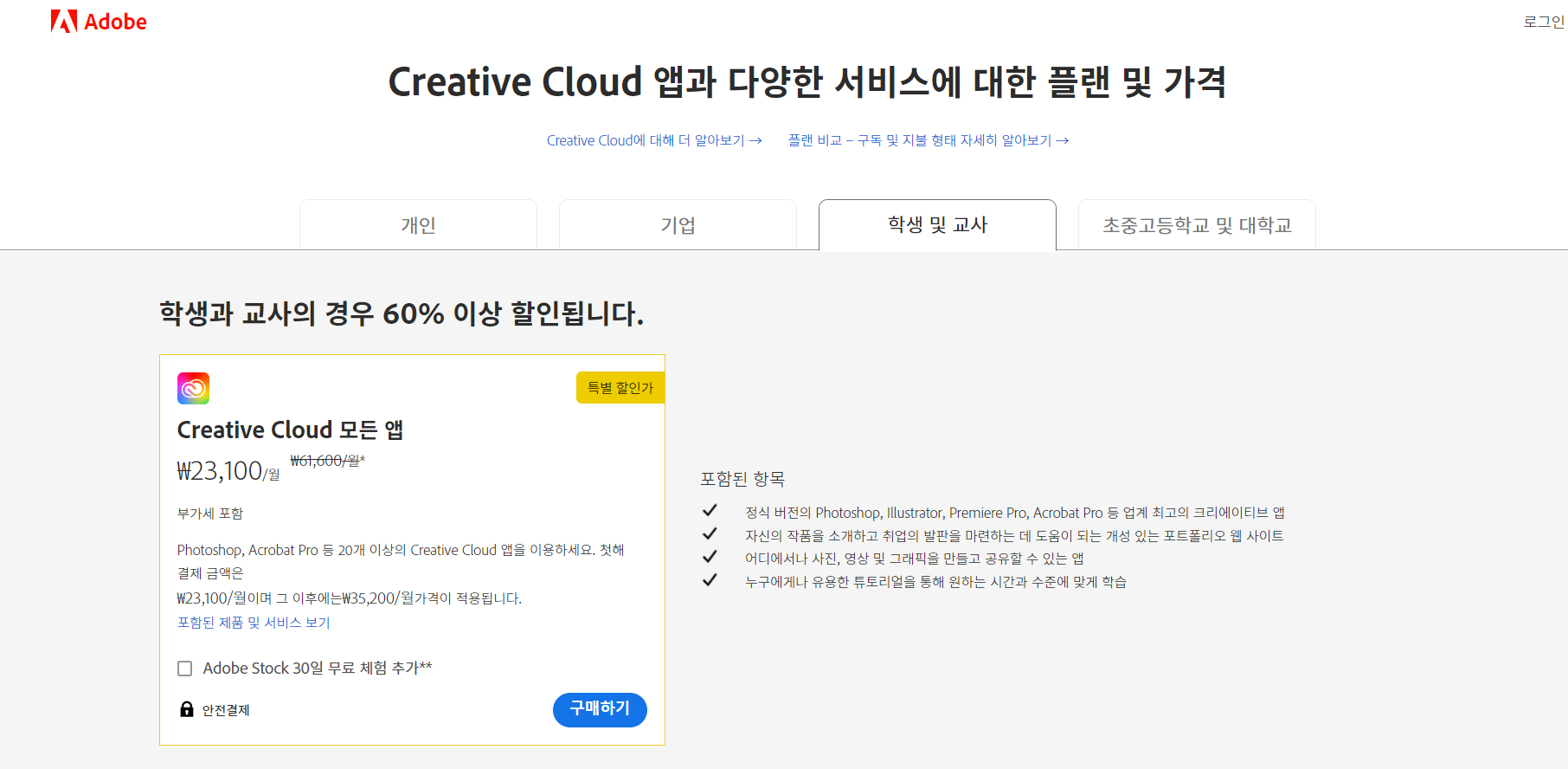 최근에 Adobe의 교육 플랜을 사용하려다가 황당한 경험을 하여 블로그 기록을 남깁니다.