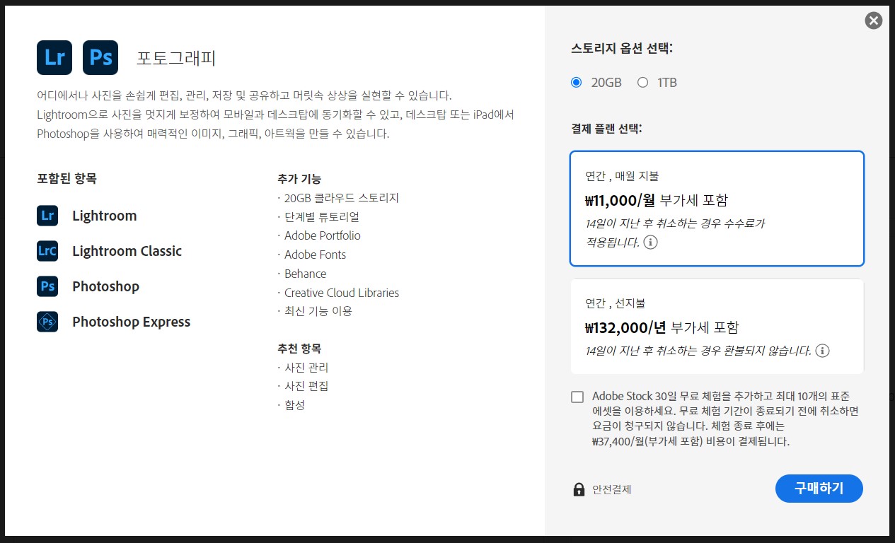 다만 학기 초에 어떤 프로그램을 사용하는지 모르는 상황에서 학생 플랜을 사용하기에 조금 부담이 되어 포토그래피 플랜월/11,000원을 선택하였습니다.