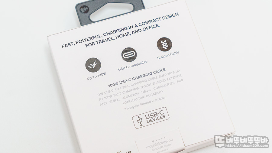 패키지 뒷면에는 PD 100W 충전, USB-C 급속 충전, 나일론 소재가 사용된 패브릭 케이블, 알루미늄 소재의 몰딩과 USB-C 단자, 2년 품질 보장 등 제품의 특징을 한껏 확인할 수 있습니다.