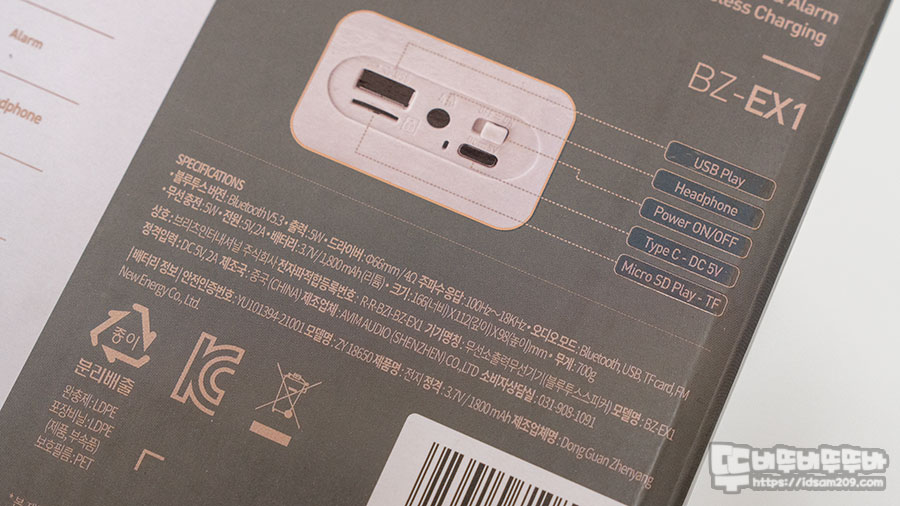 한쪽 측면에는 제품의 특징인 블루투스 5.3 버전 탑재, FM 라디오, MicroSD/USB 메모리를 이용한 MP3 플레이, 무선 충전 지원, 시계/알람 지원, 헤드폰 출력, 66mm 드라이버 유닛, 무선 충전부 패브릭 디자인, 우드 스타일 인클루저 사용 등의 특징과 제품 뒷면에 I/O 포트 설명을 확인할 수 있고요.