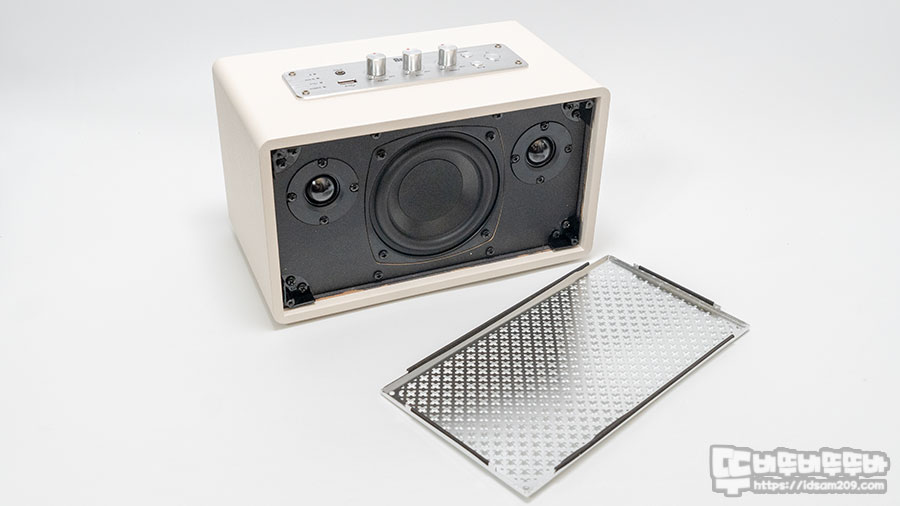 메탈 그릴은 MDF 인클로저와 전면의 스피커 유닛이 부착된 플레이트 사이에 끼워지는 형태로 20mm 트위터 (5W) 2개 사이에 101.6mm 우퍼 (15W ) 구성을 확인할 수 있었습니다.