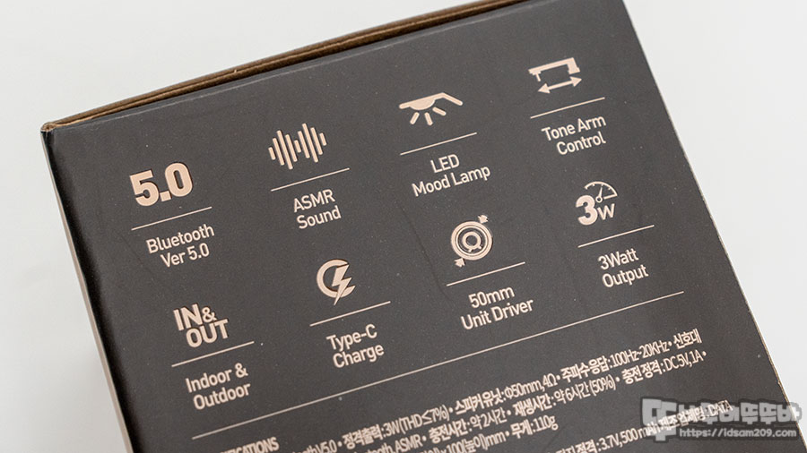 패키지 하단에는 블루투스, ASMR, 미니 턴테이블 디자인, LED 이펙트 등을 추가로 강조하고 있습니다.