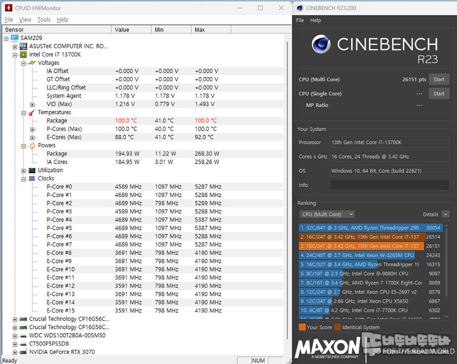 BIOS 설정 초기값 테스트 시 온도는 100도를 보여주며 시네벤치 R23의 멀티 코어 점수가 26,151 pts 점을 보여주고요.