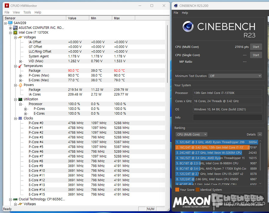 ASUS Performance Enhancement 3.0만 활성화했을 때 시네벤치 R23의 멀티 코어 점수가 27,016 pts 점으로 BIOS 초기값으로 테스트 시 피크 전력치도 전력소비도 28.52W 줄어들면서 온도도 낮아지는 모습을 확인할 수 있었습니다.