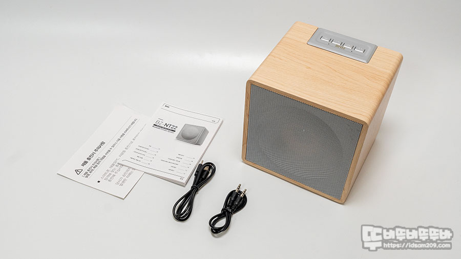 제품 구성은 BZ-NT22 블루투스 스피커 본체, 3.5mm AUX 케이블, USB-C to A 충전 케이블 그리고 매뉴얼로 구성되어 있습니다.