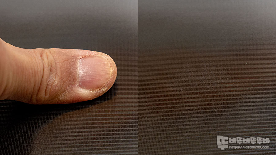 패드의 움직임을 잡아주는 바닥면은 빛이 반사될 정도의 광택이 느껴지는데 확대경을 확대해 보니 미세한 사각형 격자로 촘촘하게 디자인된 메모리 셀 폴리우레탄 소재가 사용되어 기분 좋은 끈적임으로 책상에 촥! 달라붙는 밀착력을 보여주는데 보통의 포론 소재보단 끈적임이 강한 느낌입니다.