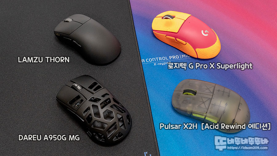 X-raypad 아쿠아컨트롤프로 블랙과 네온 패드에 LAMZU THORN / DAREU A950G MG / 로지텍 G Pro X Superlight / Pulsar X2H [Acid Rewind 에디션] 마우스를 사용하여 차이를 확인해보려고 합니다.