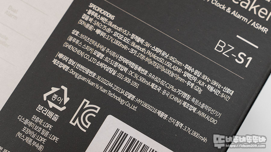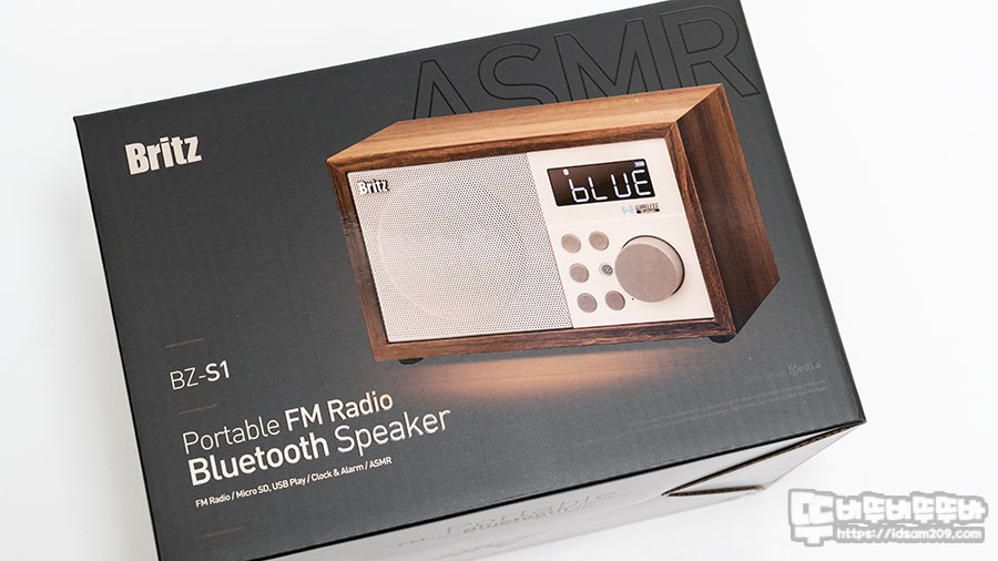 패키지에 제품의 이미지와 모델명 BZ-S1 포터블 라디오 그리고 블루투스 스피커 그리고 올인원 제품답게 FM라디오, MicroSD, USB MP3 플레이, 시계 & 알람, ASMR 사운드 등의 강조가 눈에 띕니다.