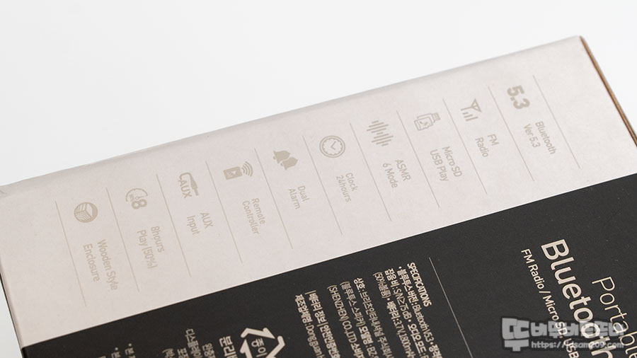 블루투스 5.3, FM 라디오, MicroSD/USB Play, 6가지 ASMR, 시계, 듀얼 알람, 리모컨 지원, AUX 입력, 8시간 재생 (50% 볼륨), MDF 인클로 등의 내용과 스펙 정보에서는 포인트 정보 이외 5W 출력의 52mm 드라이버 유닛, 1800mAh 배터리 용량, 170 X 70 X 100mm 크기, 620g 무게 정보를 확인할 수 있네요.