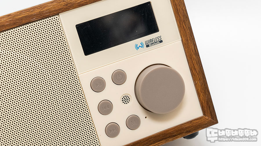 전면부의 컨트롤 버트는 재생/일시 정지, 트랙 이동이 각인된 기능 버튼과 전원 버튼, 모드 버튼 그리고 볼륨 노브로 구성이 되어있어 직관적인 제어가 가능하지만 거치된 상태에서 조작하는 경우 누르는 힘에 스피커가 뒤로 밀릴 수 있으니 가급적 리모컨을 이용하시는 걸 추천드립니다.