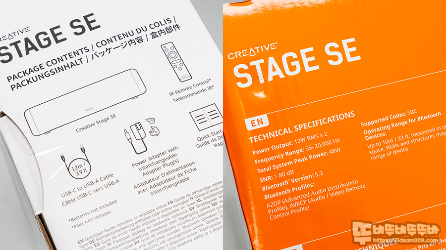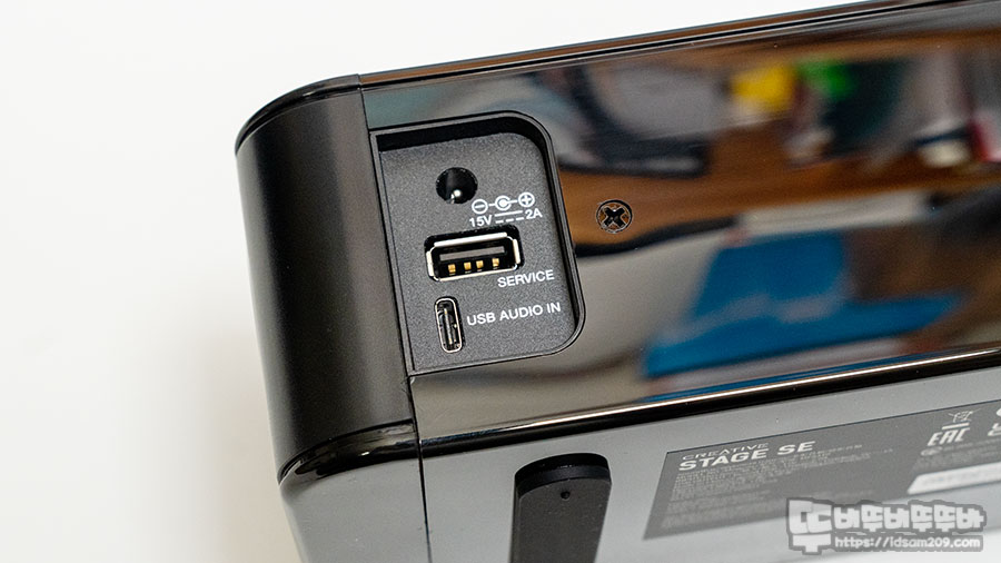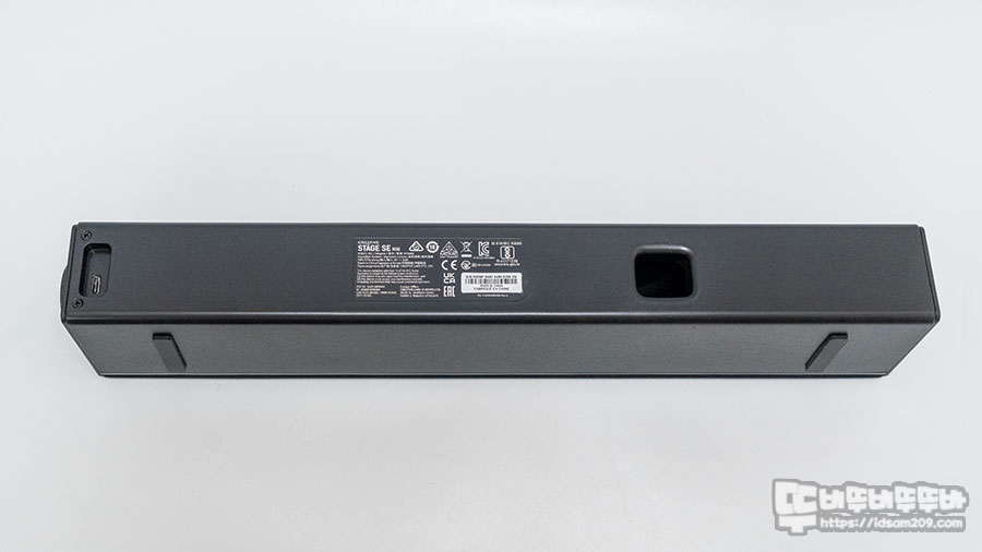 Creative STAGE SE는 410 X 108 X 68mm 크기로 mini 제품보다 앞뒤로 두껍고 살짝 높은 게 특징이며 USB 전원이 아닌 DC 15V 2A 전원을 사용하며 12W 출력의 스피커 2개 구성으로 RMS 24W 최대 피크 출력 48W를 지원하는데요.