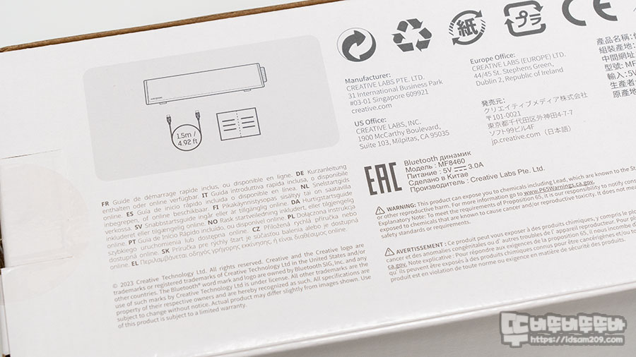 Creative STAGE SE Mini 패키지는 제품의 이미지와 모델명, 블루투스 지원과 헤드폰 출력을 지원하는 내용을 아이콘으로 잘 표현하고 있습니다.