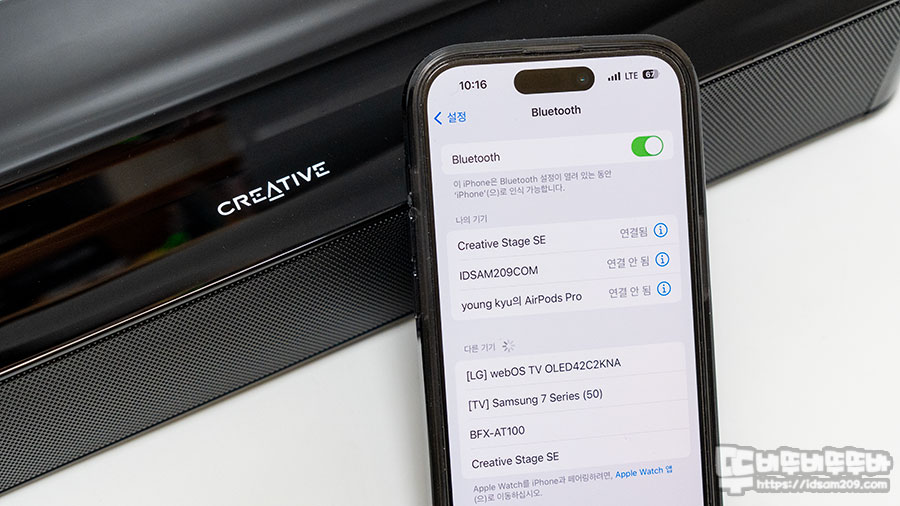 블루투스 페어링 모드 시 스마트폰 블루투스 기기 리스트에 등장하는 Creative STAGE SE를 선택하면 페어링이 완료되며 최초 페어링 이후에는 오토 페어링으로 사용되기에 블루투스 모드를 선택하면 자동으로 스마트폰과 연결되고요.