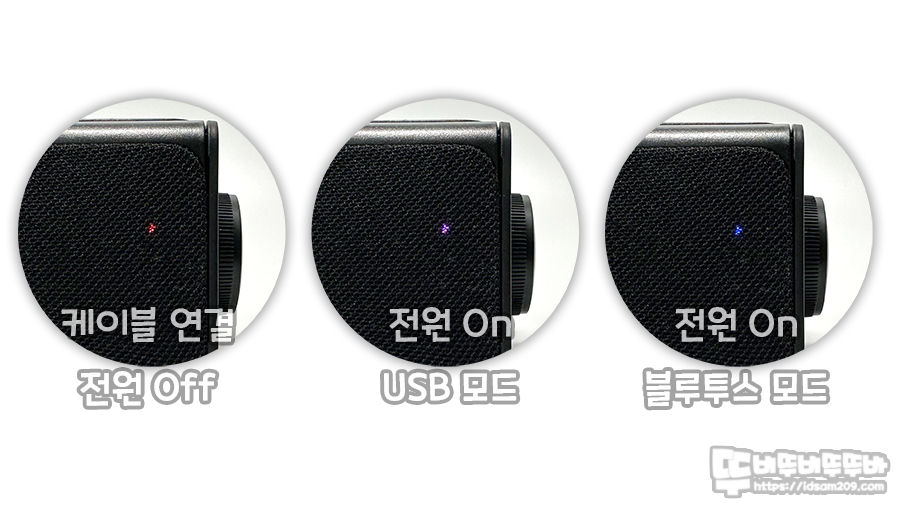 전면 그릴을 통해 확인이 가능한 LED 인디케이터는 케이블을 연결하면 Red LED 점등으로 대기모드를 표현하며 볼륨 다이얼을 눌러서 전원을 켜면 Purple LED 그리고 블루투스 모드로 변경 시 Blue LED로 표현되어 현재 모드 상태에 대한 정보를 빠르게 알 수 있습니다.