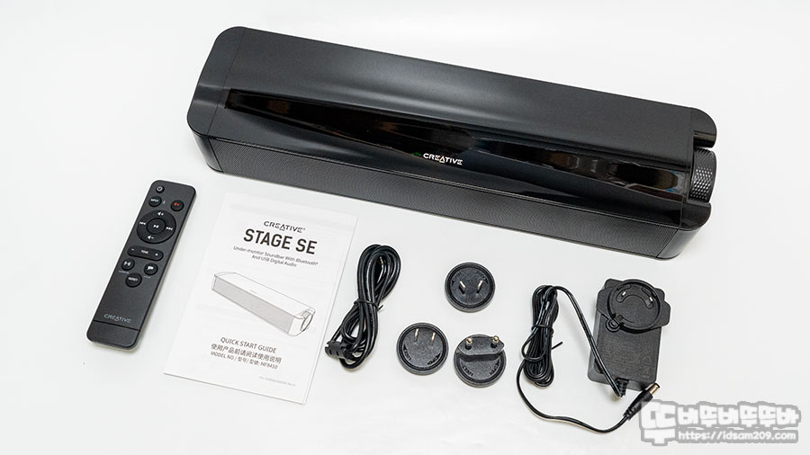 제품은 STAGE SE 본체, 리모컨, 사용설명서 USB-C to A 케이블, 전원 아답터로 구성되어 있습니다.