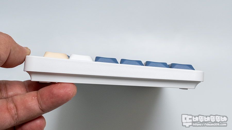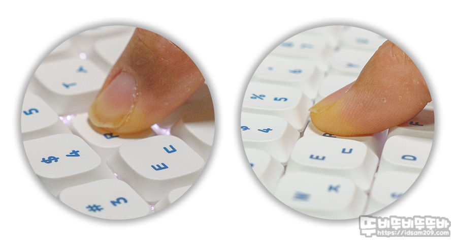 다만 키캡이 깊게 눌리는 형태라 타이핑을 할 때 손끝을 세워서 찍어 누르는 형태로 타이핑하는 유저가 아니라면 위의 사진과 같이 키캡이 눌리면서 주변에 키캡에 닿는 느낌이 있어 불편함을 느낄 수 있으니 참고하시면 좋을 거 같습니다.