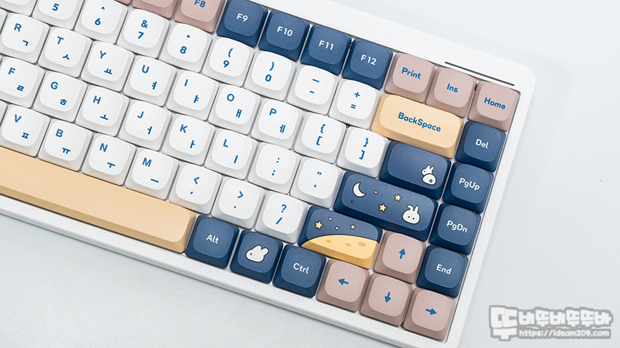 키캡은 PBT 염료승화 방식으로 밋밋한 자판 느낌이 아닌 귀염뽐짝 이미지를 인쇄하여 달토끼 에디션으로 출시하였습니다.