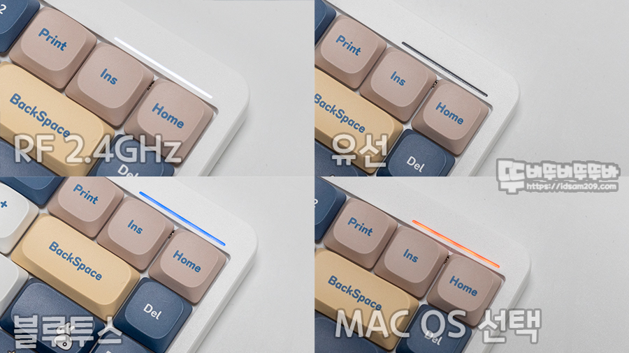 RF 2.4GHz(화이트), 유선( LED Off), 블루투스 (블루), MAC OS 선택 시 (레드 점멸)로 표현하여 현재상태가 어떤 상태인지 알 수 있었습니다.