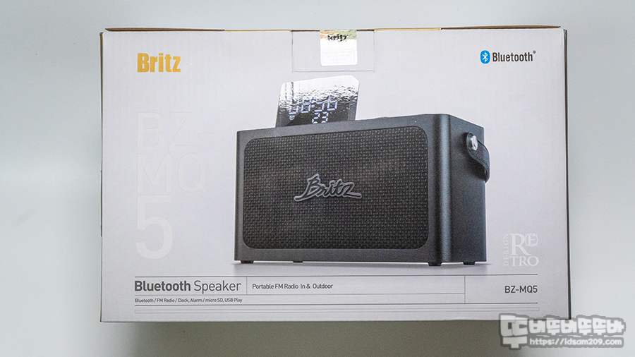 Britz 브리츠 BZ-MQ5 블루투스 스피커 패키지는 다양한 기능인 블루투스, FM 라디오, 시계/알람, MicroSD 및 USB 메모리 재생, AUX 입력, 디지털 온도계 등의 기능을 지원하는 내용을 확인할 수 있고요.