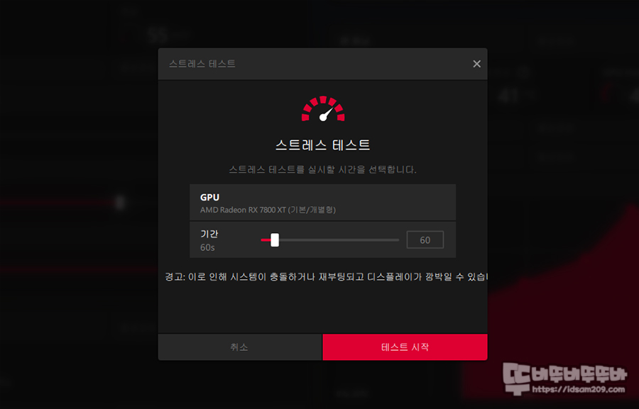 모든 설정이 끝난 후 스트레스 테스트를 통해 안정성을 확인해 보시면 좋은데 기본 테스트 시간 60초 ~ 600초 테스트가 가능하니 편차가 큰 값이 아니기에 5분 내외로 테스트해 보시는 것을 좋을 거 같습니다.