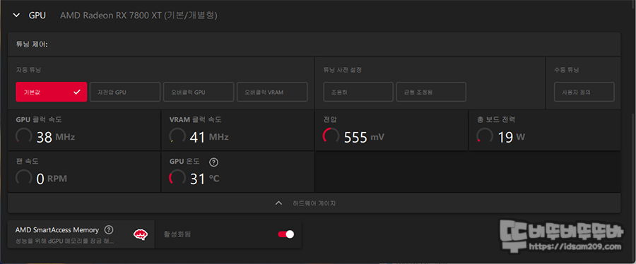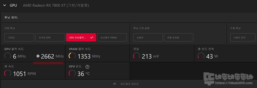 자동 튜닝 항목에는 " 기본값 / 저전압 GPU / 오버클럭 GPU / 오버클럭 VRAM "