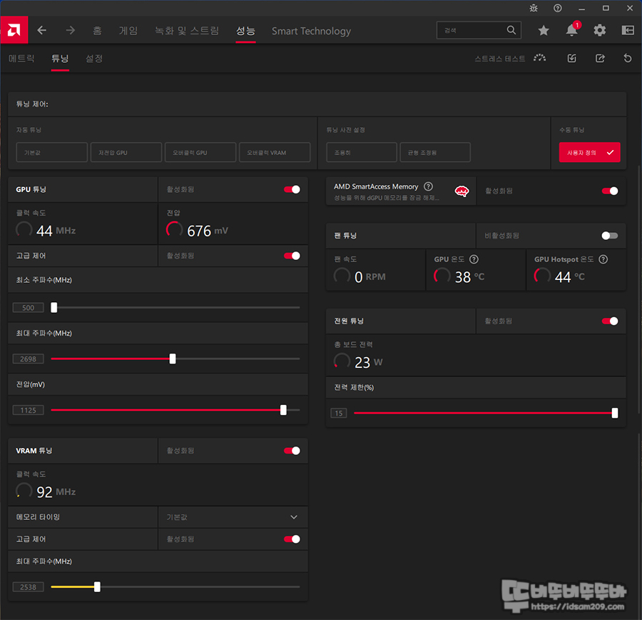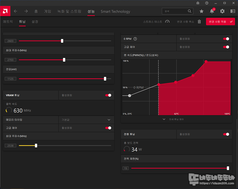 마지막으로 정해진 값이 없는 전력 제한 설정 그리고 필요에 따라 팬 튜닝 활성화 후 고급 제어 활성화로 수동으로 설정하실 수 있습니다.