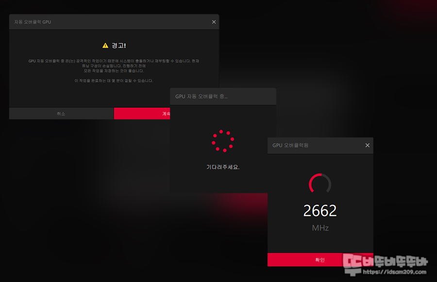 오버클럭 VRAM의 경우는 계속 버튼을 누르면 화면에 잠시 나갔다가 다시 들어오면서 결과 값을 보여주니 참고하기 바랍니다.