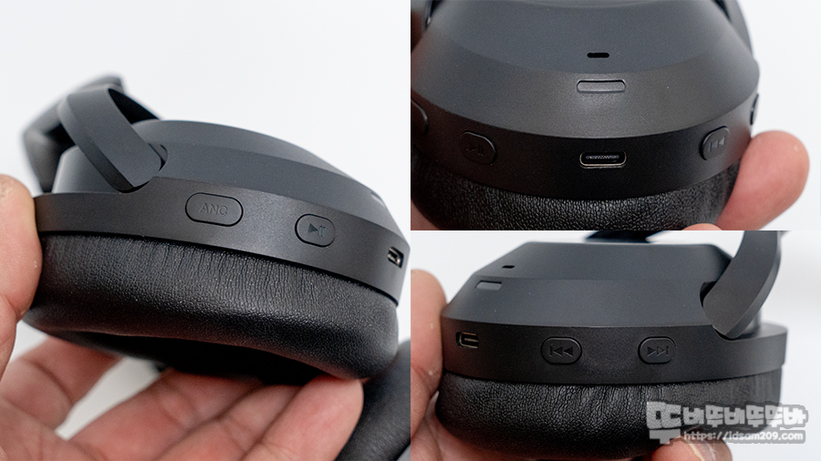 왼쪽 이어컵 하우징은 중앙 하단 USB-C 충전단자를 기준으로 앞쪽으로 ANC 버튼(액티브 노이즈 캔슬링/앰비언트 모드/ANC Off 기능), 재생 및 일시 정지 버튼 뒤쪽으로 트랙 이동 버튼 그리고 충전 단자 위로 충전 관련 LED 인디케이터 모습을 확인할 수 있네요.